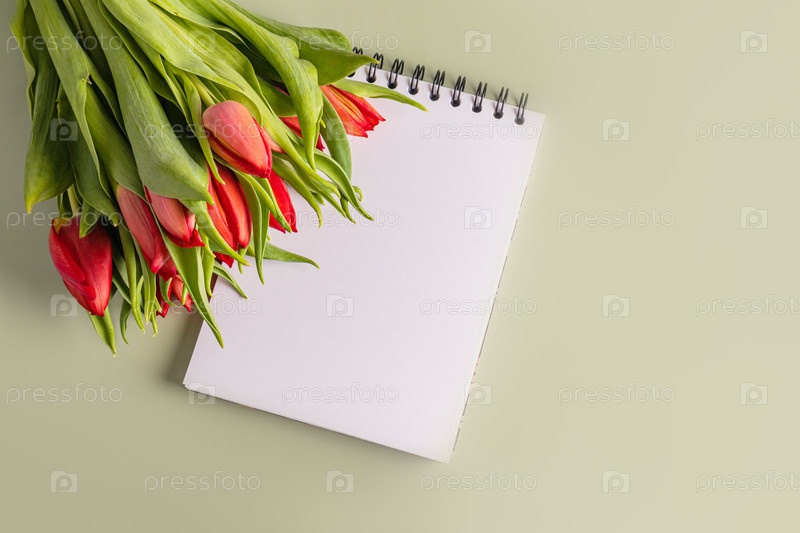 Букет ярких весенних тюльпанов на зеленом фоне с открытым ноутбуком, загруженным пружиной. пустой макет белых страниц для текста. верхний вид