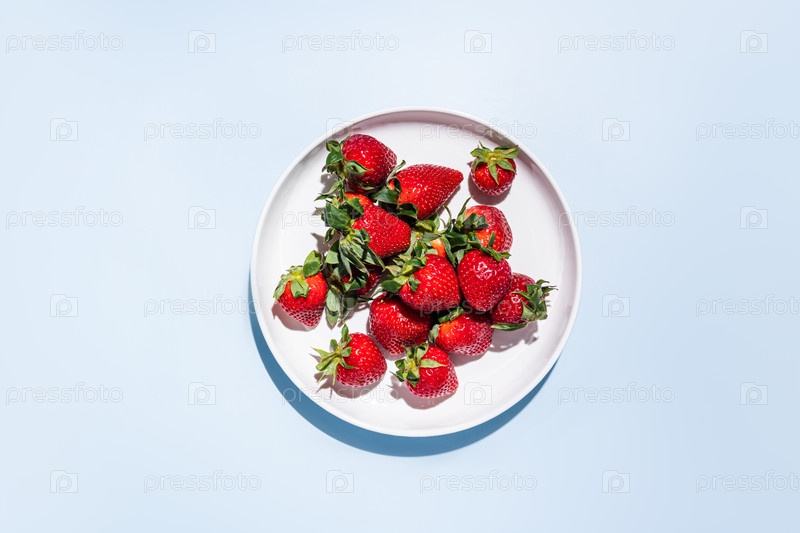 Вид сверху белой керамической тарелки со спелыми сочными клубниками на синем фоне. копировальное пространство. макет для рекламы продукта. шаблон продукта