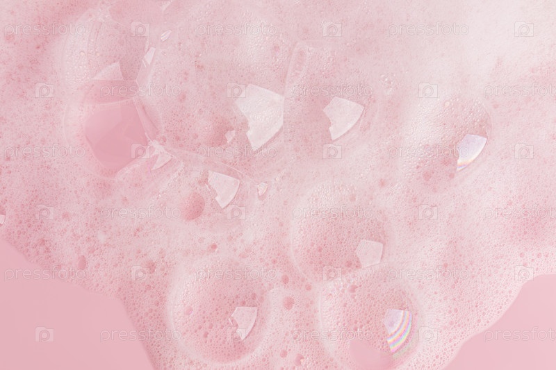 Большие прозрачные мыльные пузыри, мягкая пеновая масса мыла, гель, моющее средство на розовом фоне. Концепция гигиены и чистоты. Вид сверху. Копировальное пространство