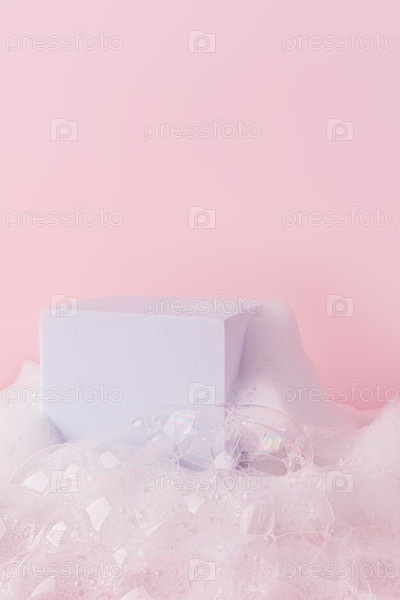 Белая подиум стоит в пушистой плотной белой пены мыла с большими прозрачными пузырями. вертикальный вид спереди. розовый фон. макет для дизайна