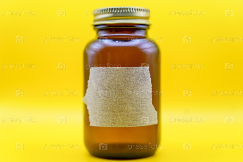 Янтарная стеклянная банка с пустой этикеткой на желтом фоне