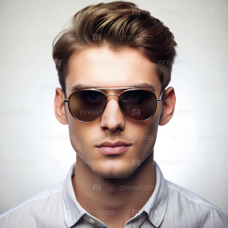 Стильный молодой человек в солнцезащитных очках на мягком белом фоне