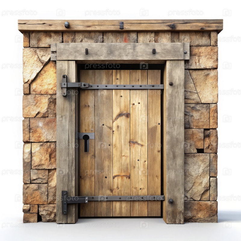 Вход в шахту, построенный из дерева и камня на белом фоне
