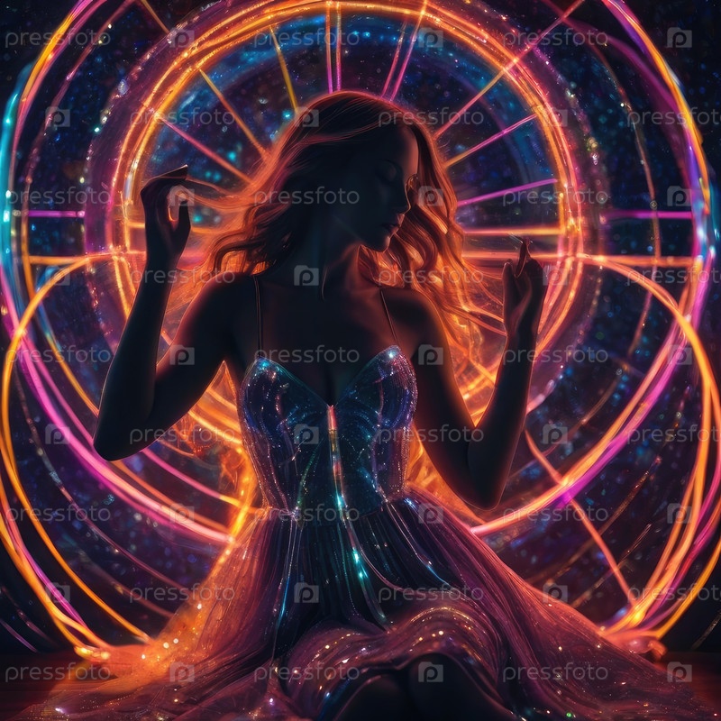 Эфирная фигура, освещаемая яркими световыми следами в космической обстановке ночью