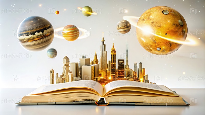 Научно-фантастическая книга открывается на космический городской пейзаж с планетами над головой