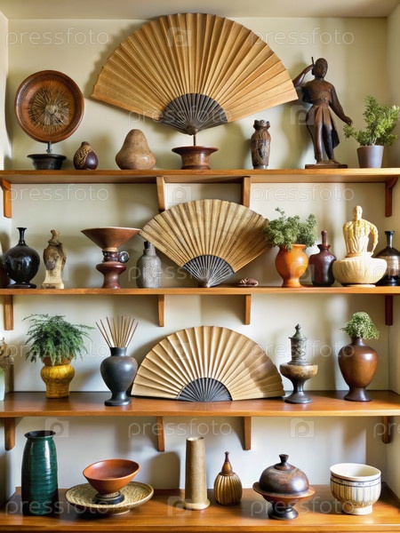 Экспозиция разнообразных культурных артефактов, включая японских болельщиков и африканские скульптуры