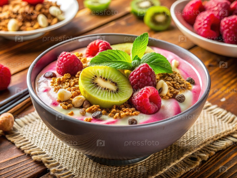 Чаша малинового йогурта с греналой и свежими фруктами на деревянном фоне