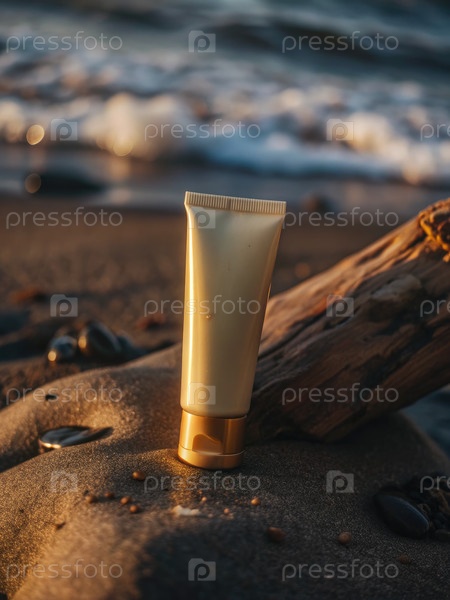 Близкий план сливочной трубы, отдыхающей на пляже при закате солнца с нежными волнами