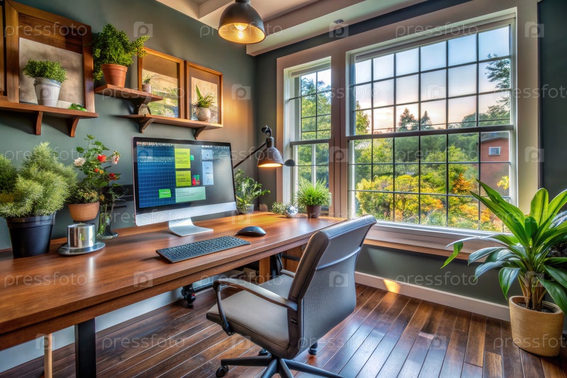 Яркое рабочее пространство домашнего офиса с растениями и компьютером на закате