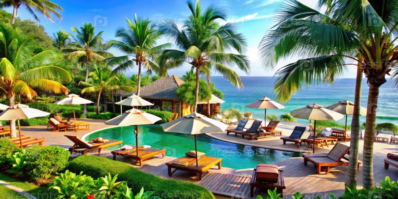 Роскошный пляжный курорт с пальмами и потрясающим видом на океан при закате