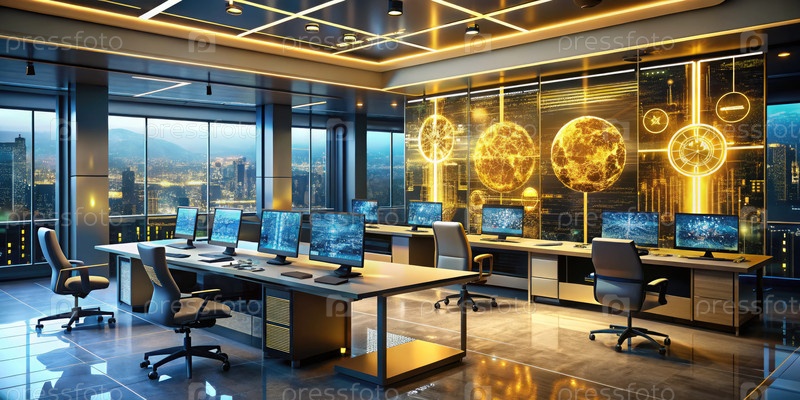Футуристический офис с золотыми голографическими дисплеями в высокоэтажной городской обстановке