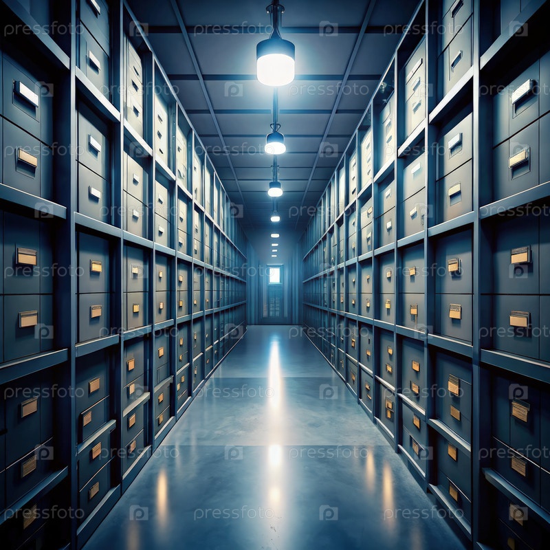 Длинный коридор темных файловых шкафов в капризной офисной среде