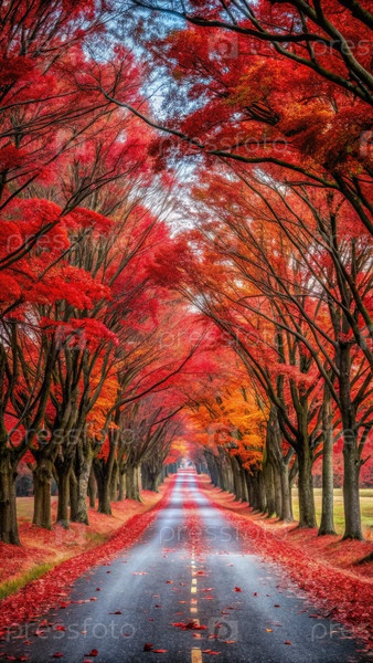 Спокойная дорога, облицованная яркими осенними деревьями, демонстрирующими осенние листья