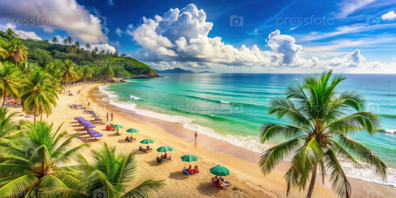 Солнечный пляжный день с пальмами и яркими зонтиками под ясным небом