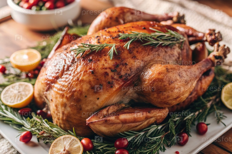 Близкий план золотой индейки Дня благодарения, украшенной травами и цитрусовыми