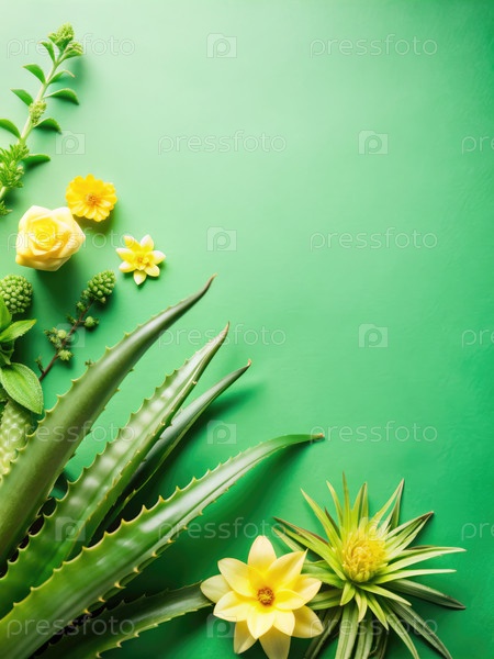 Алоэ растения и яркие цветы на зеленом фоне