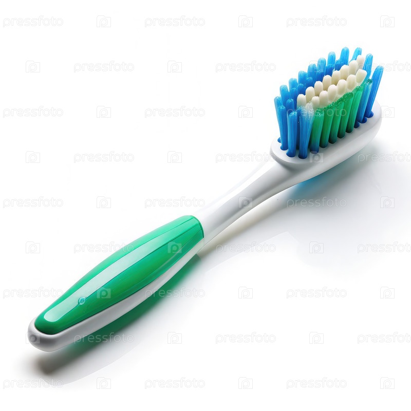 Зубная щетка с цветными волосками, опирающимися на белый фон для ухода за зубами