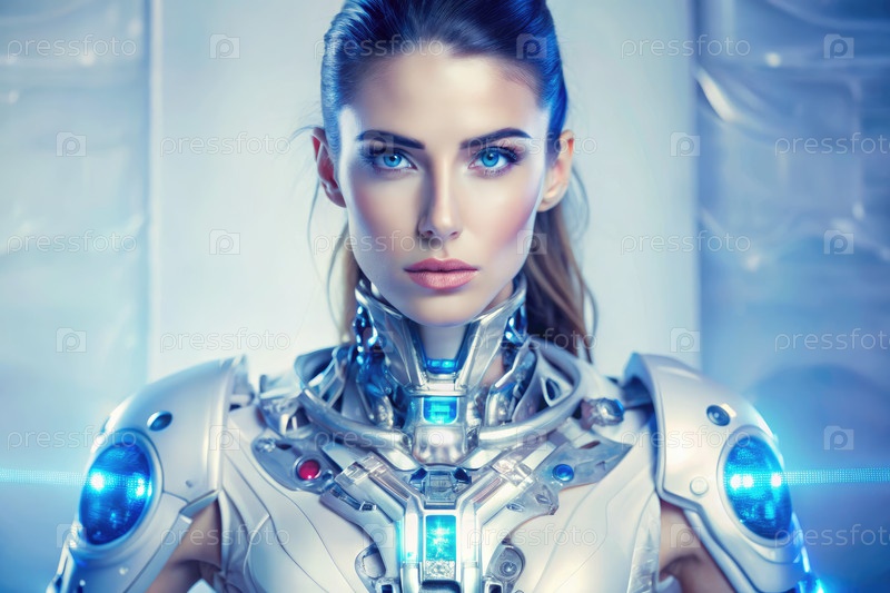 Потрясающая женщина-киборг пристально смотрит на камеру в футуристической обстановке