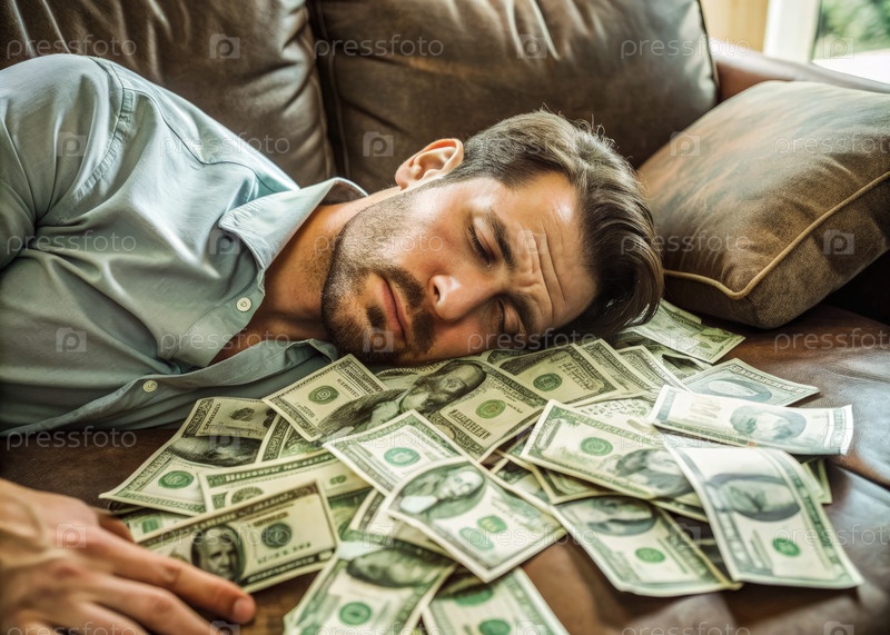 Печальный человек, лежащий рядом с кучей денег на диване в слабо освещенной комнате