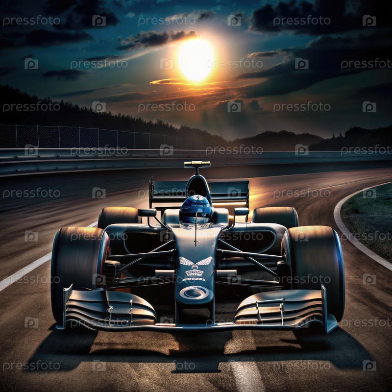 Формула-1 гоняется на лунной трассе в сумерках в глубокой тени
