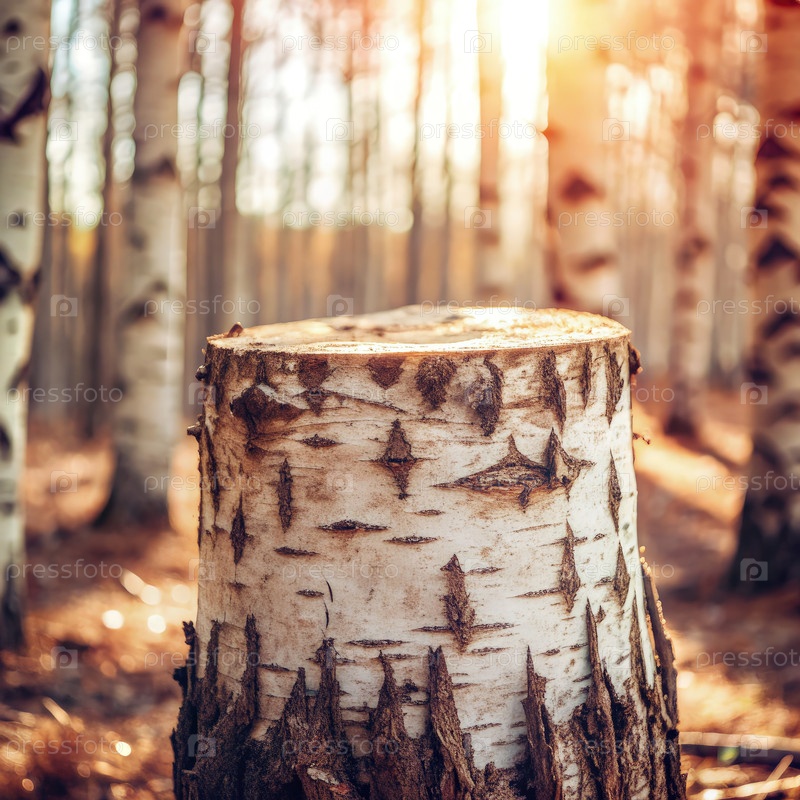 Березовый стебель в лесу с мягким солнечным светом, сияющим сквозь деревья