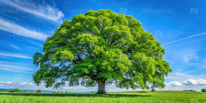 Величественное высокое еловое дерево в полном летнем листье на фоне ярко-синего неба