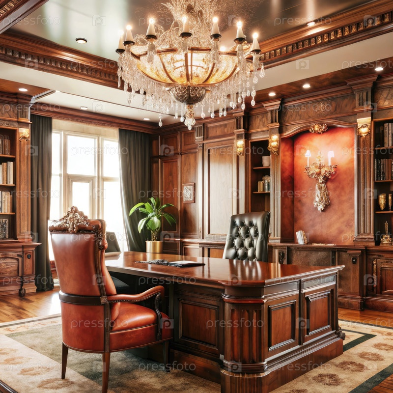 Роскошный офис генерального директора с элегантным деревянным декором и люстрами в дневное время
