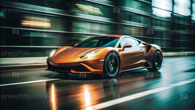 Утонченный оранжевый спортивный автомобиль маневрирует по городским улицам в дождливые дни