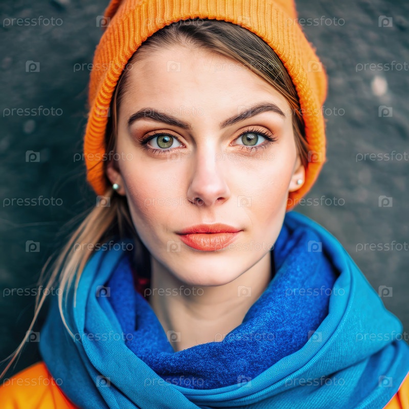Женщина в оранжевой шапочке и синем шарфе позирует на темном фоне