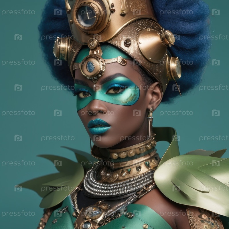 Африканская королева, украшенная ярким зеленым и бронзовым нарядом с впечатляющими аксессуарами