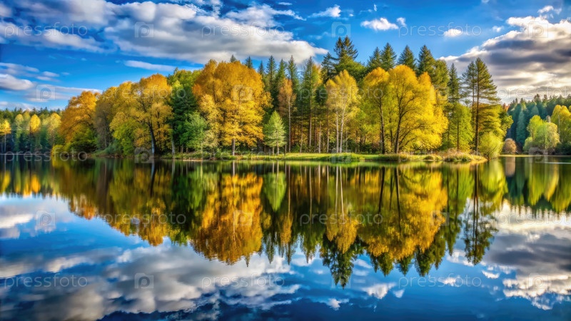 Отражение красочных деревьев в тихом озере во время осеннего дня