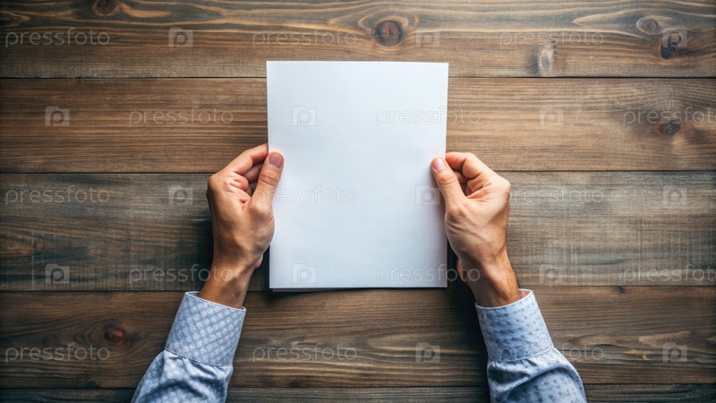 Человек, держащий пустую бумагу над деревянным столом на рабочем месте