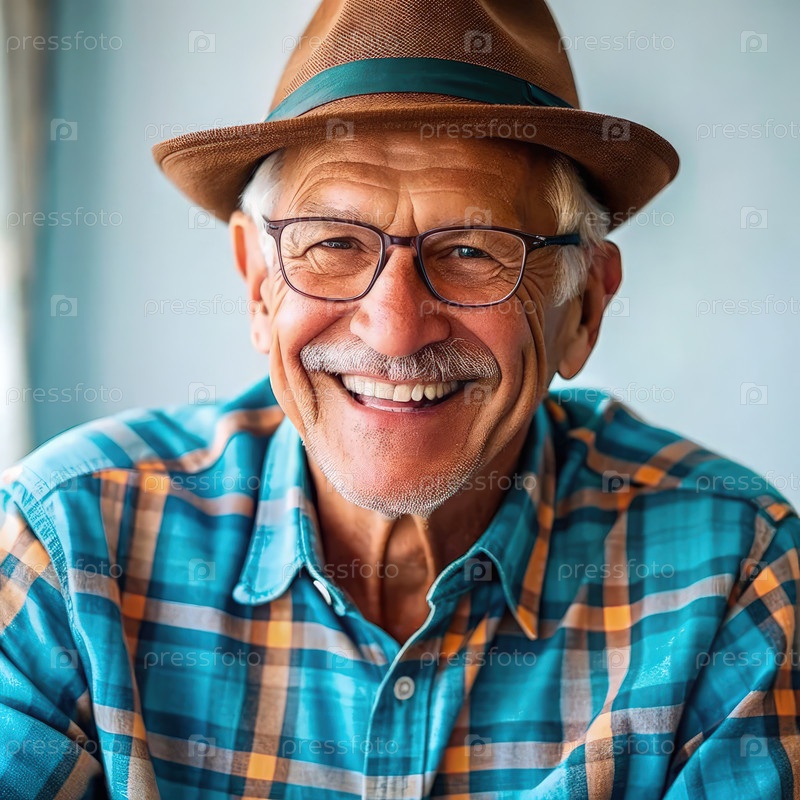 Улыбающийся пожилой мужчина, носящий шляпу и очки в помещении днем