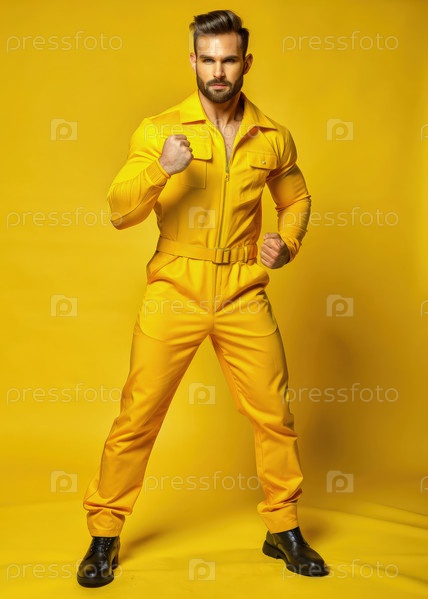 Уверенный в себе мужчина в ярко-желтом костюме позирует на соответствующем фоне