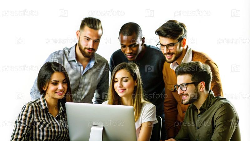 Группа разнообразных веб-разработчиков, сотрудничающих над проектом в ярком рабочем пространстве