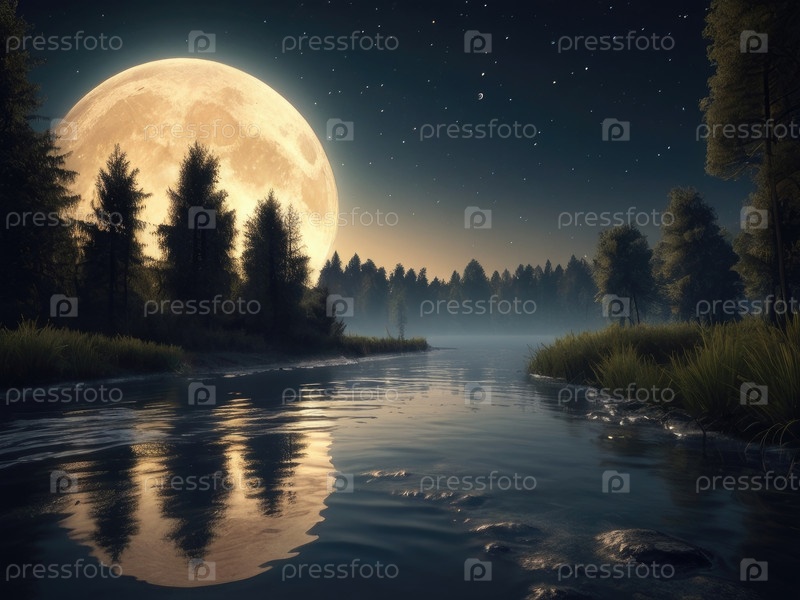 Луна освещает реку, отражающую деревья и полную луну ночью