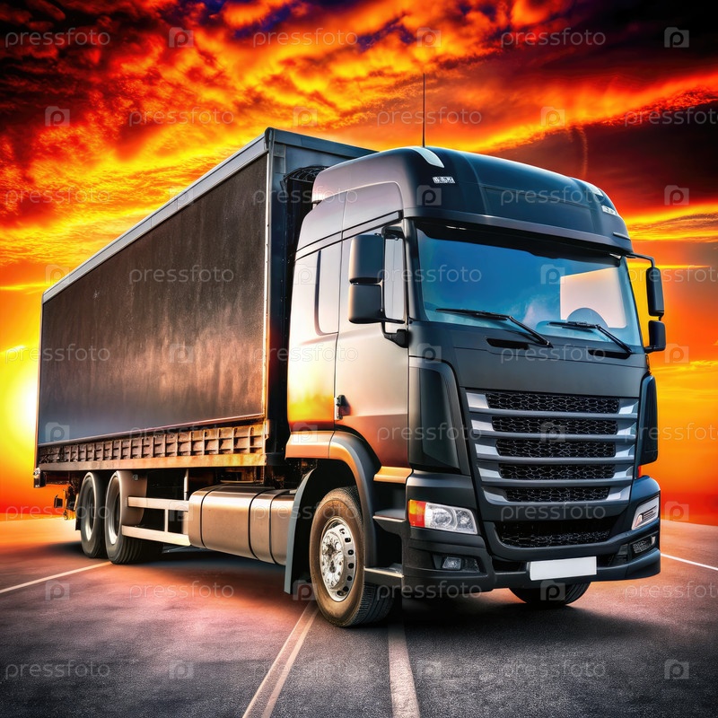 Черный грузовик с багажным ящиком на фоне заката солнца на открытой дороге
