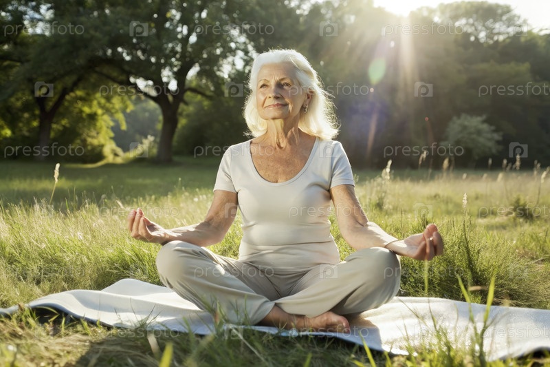 Пожилая женщина мирно медитирует в солнечном парке, окруженном зеленью