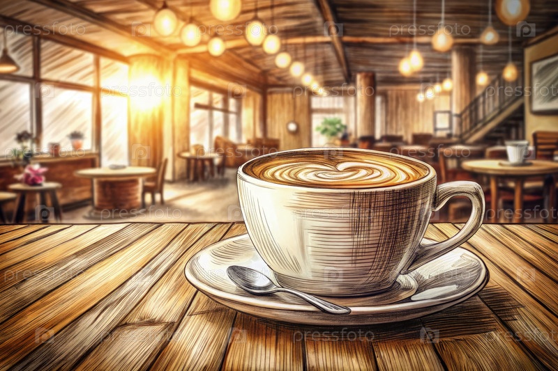 Ручно нарисованный эскиз кофейной чашки на деревянном столе в уютной обстановке кафе