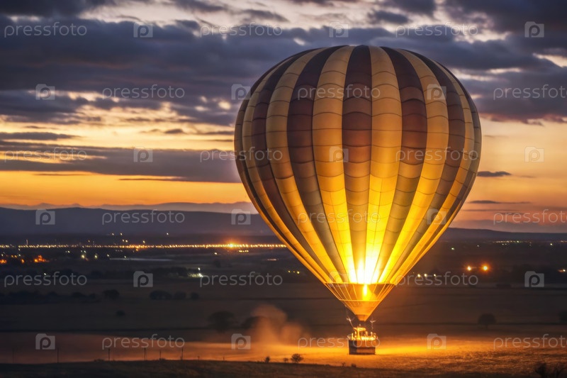 Балон с горячим воздухом мягко приземляется на закате, демонстрируя яркие цвета в небе