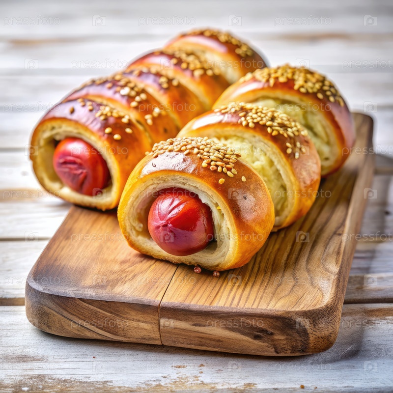 Вкусные колбасы, завернутые в тесто и посыпанные кунжутными семенами на деревянной доске