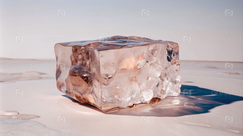 Большой плоский кусок прозрачного льда, опирающийся на гладкую поверхность при дневном свете