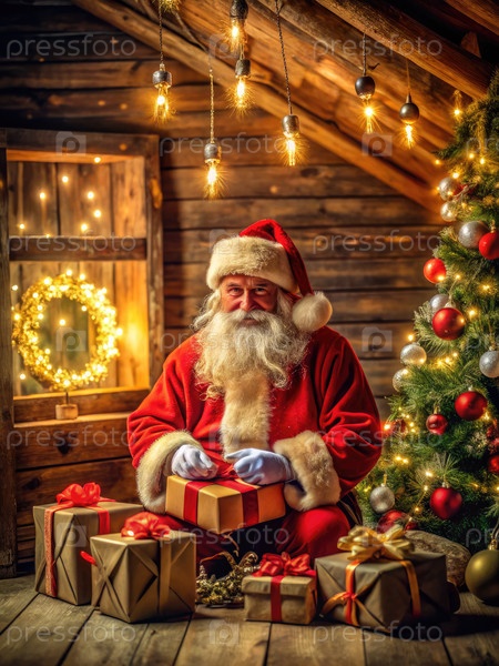 Санта-Клаус готовит подарки в деревянной хижине во время праздничного сезона