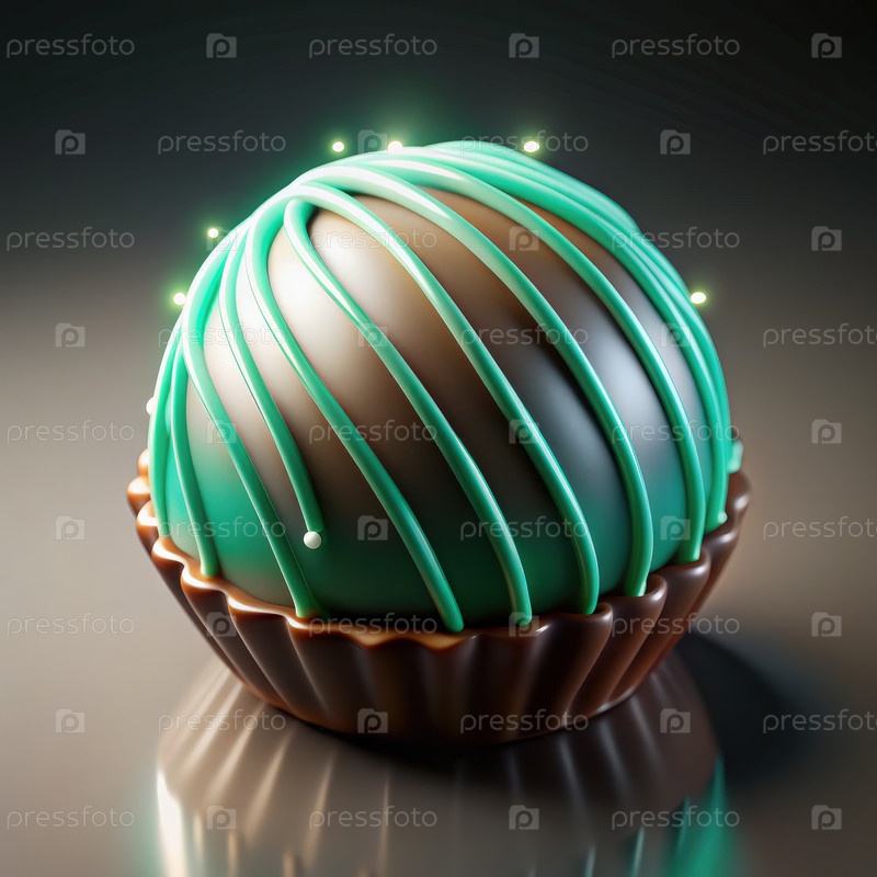 Богатая изумрудная шоколадная конфета отображается на темной поверхности с яркими акцентами