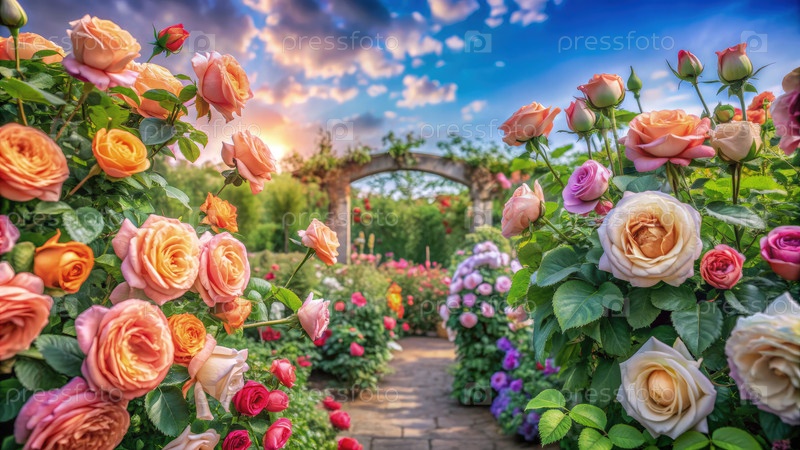 Яркий розовый сад, цветущий на закате с красочными цветами и аркой
