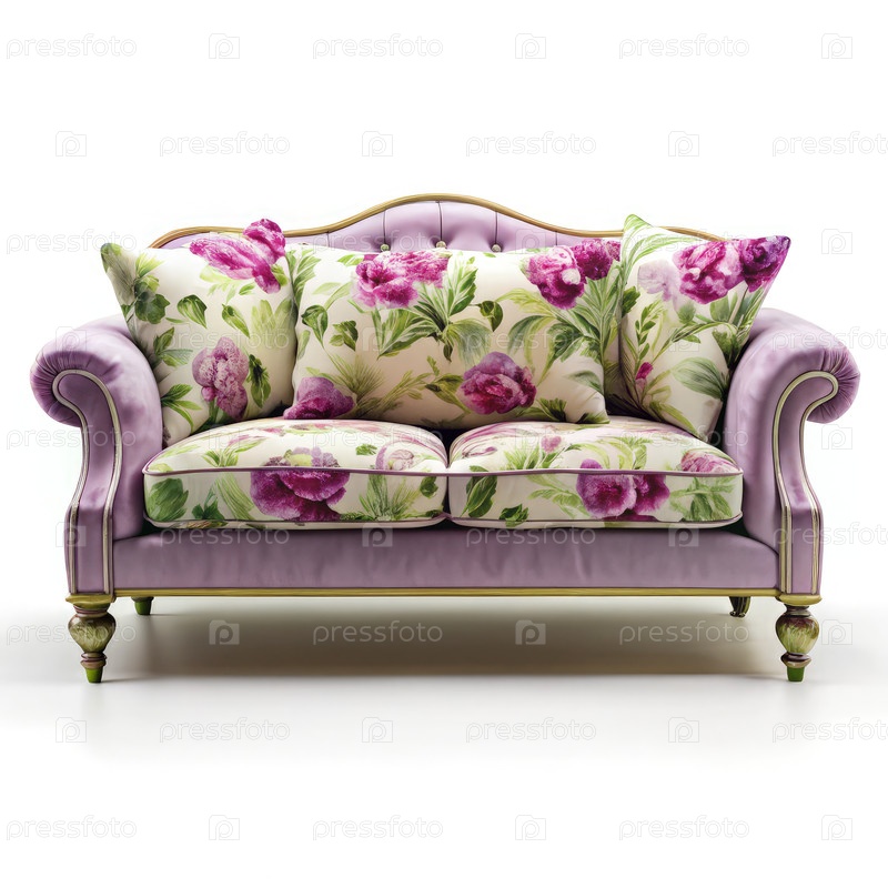 Элегантный диван с орхидеями с цветочными подушками, расположенными на чистом белом фоне