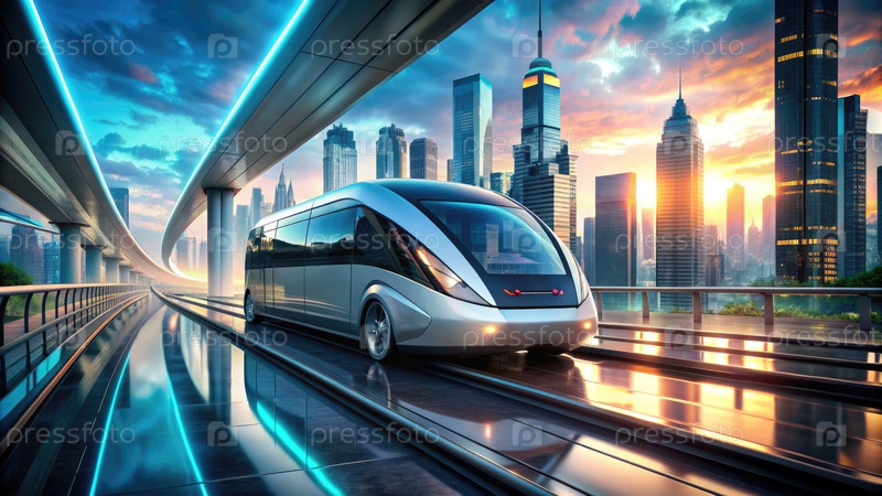 Футуристическая транспортная система в оживленном городском пейзаже на закате