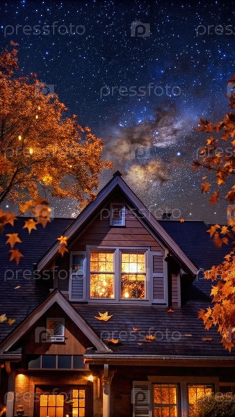 Листья, разбросанные на крыше очаровательного дома под звездным ночным небом