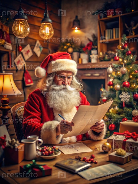 Санта-Клаус рассматривает длинный рождественский список у праздничного камина