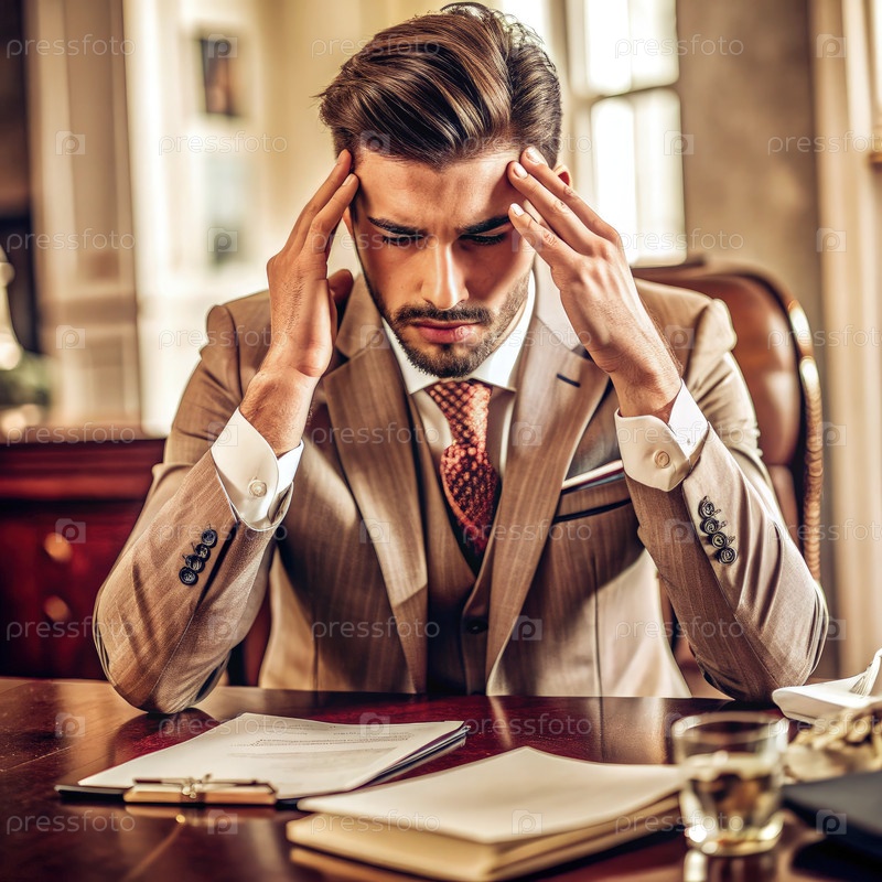 Молодой бизнесмен в костюме, показывающем стресс за рабочим столом